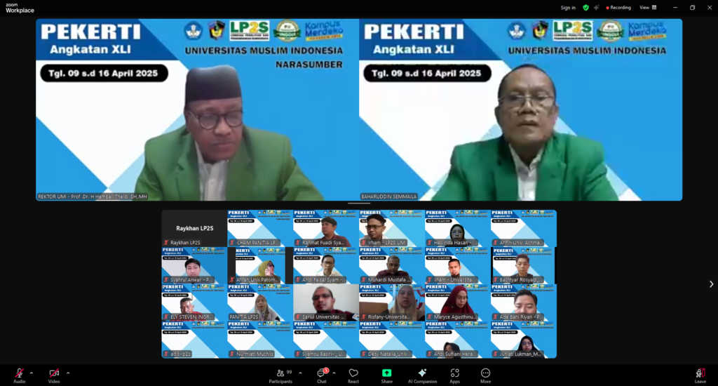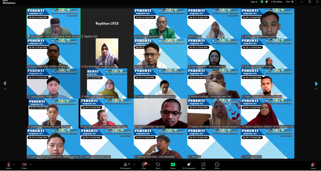 Makassar, umi.ac.id – Lembaga Penelitian dan Pengembangan Sumberdaya (LP2S) Universitas Muslim Indonesia (UMI) menggelar Pelatihan Teknik Instruksional (PEKERTI) Angkatan XLI secara Online Zoom yang berlangsung mulai tanggal 09 s.d 16 April 2025.