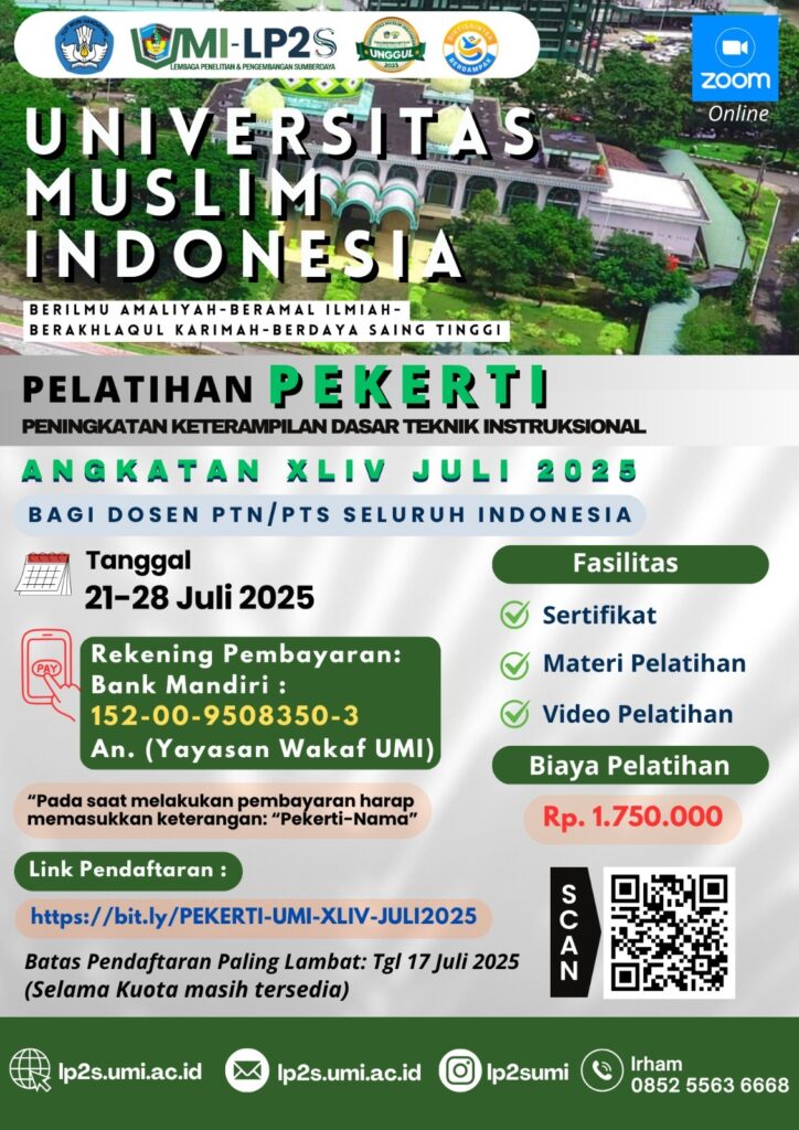 Maka dengan ini Universitas Muslim Indonesia kembali membuka pelatihan PEKERTI Angkatan XLIV (44) Tahun 2025, yang Insya Allah akan dilaksanakan pada Tanggal 21 s.d 28 Juli 2025 melalui Zoom Meeting