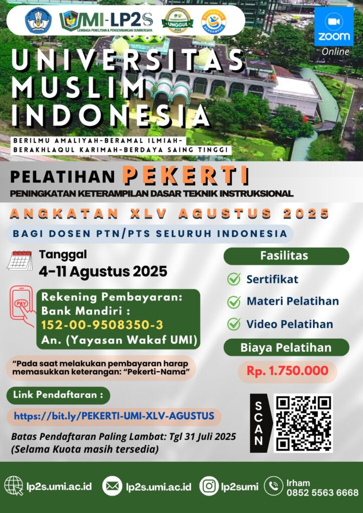 Maka dengan ini Universitas Muslim Indonesia kembali membuka pelatihan PEKERTI Angkatan XLV (45) Tahun 2025, yang Insya Allah akan dilaksanakan pada Tanggal 04 s.d 11 Agustus 2025 melalui Zoom Meeting