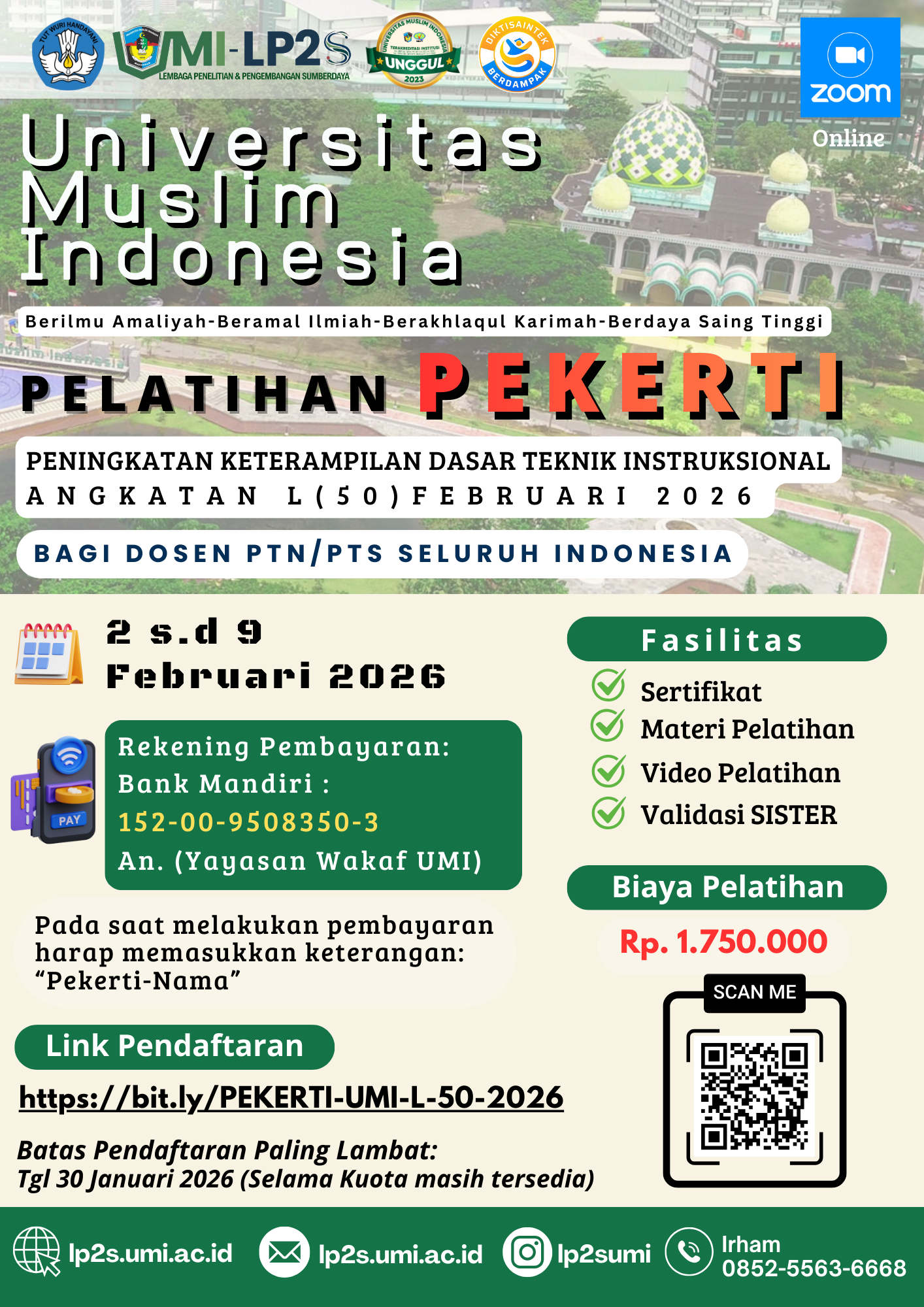Maka dengan ini Universitas Muslim Indonesia kembali membuka pelatihan PEKERTI Angkatan L (50) Tahun 2026, yang Insya Allah akan dilaksanakan pada Tanggal 02 s.d 09 Februari 2026 melalui Zoom Meeting
