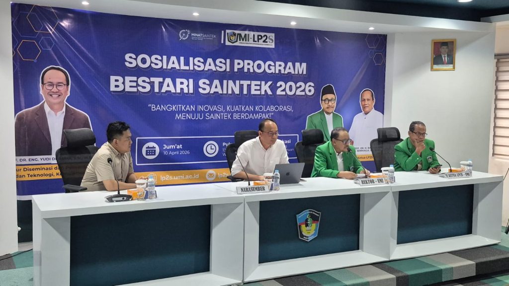 Makassar, 10 April 2026 — Universitas Muslim Indonesia (UMI) melalui Lembaga Penelitian dan Pengembangan Sumberdaya (LP2S) terus memperkuat komitmennya dalam mendorong riset yang berdampak nyata. Hal ini ditandai dengan terselenggaranya kegiatan Sosialisasi Program BESTARI Saintek dan Keberdampakan Riset yang menghadirkan langsung Direktur Diseminasi dan Pemanfaatan Sains dan Teknologi (MINATSAINTEK) Kementerian Pendidikan Tinggi, Sains, dan Teknologi.