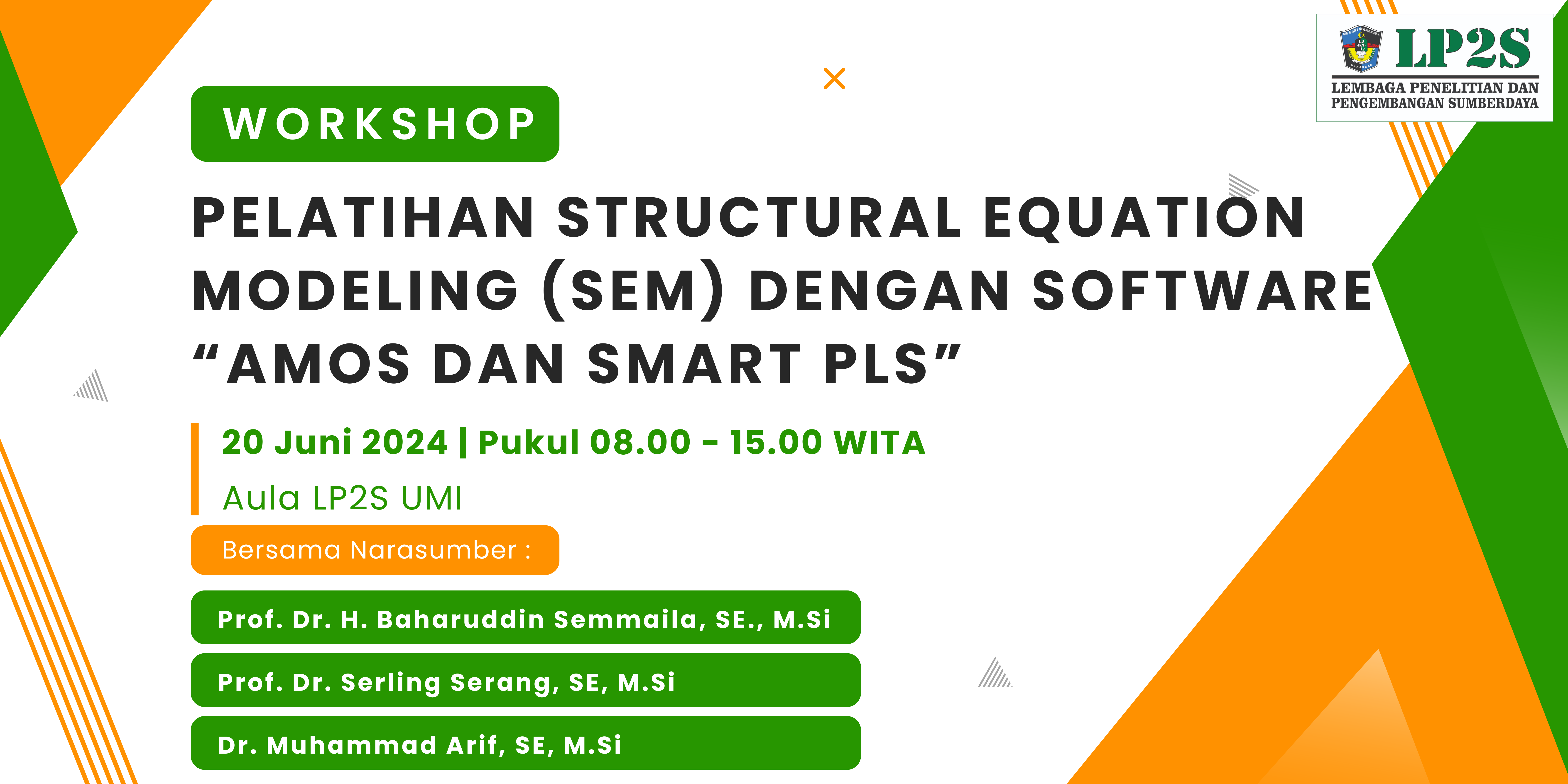 Pelatihan Structural equation modeling (SEM) dengan software “amos dan smart pls” diadakan di ruang Aula LP2S lantai 3. Pelatihan ini dihadiri kurang lebih 30 peserta yang sebelumnya mengikuti pelatihan “Kupas Tuntas Amos”. Kegiatan ini menghadirkan 3 Narasumber yaitu: Prof. Dr. H. Baharuddin Semmaila, SE., M.Si yang juga Ketua LP2S UMI, Prof. Dr. Serling Serang, SE, M.Si , dan Dr. Muhammad Arif, SE, M.Si. Pelatihan ini dimaksudkan untuk meningkatkan kapasitas dan kemandirian dosen dalam pengolahan data melalui aplikasi AMOS.